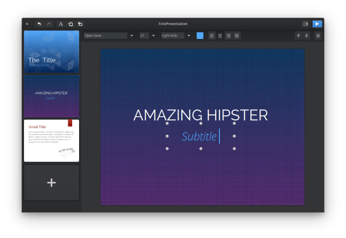 Spice-up is a modern and intuitive desktop presentations app built from the ground up for elementary OS. It gives you everything you need to create simple and beautiful presentation such as text, images, and shapes as well as beautiful background patterns and easy to make custom gradients.