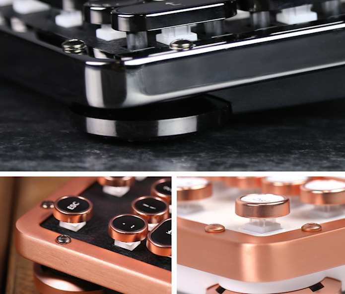The keyboard frame is forged with zinc aluminum alloy, then polished and plated into a beautiful black chrome (or satin copper finish) to accompany the leather top plate. Hex bolts are added for structural enhancements and to add an industrial vintage element to the keyboard.