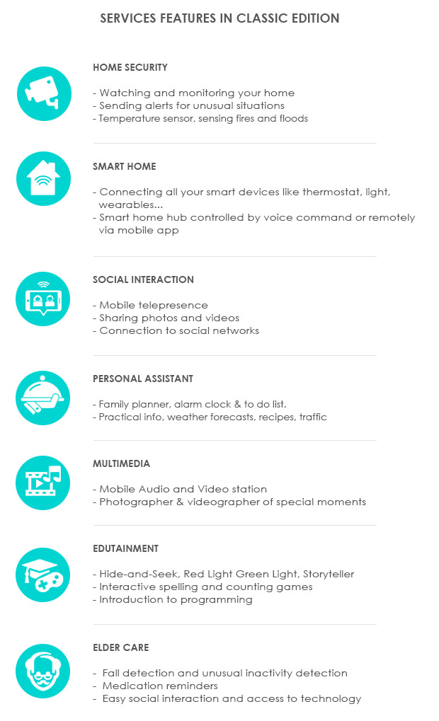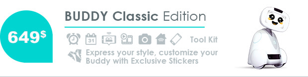 The BUDDY Classic Edition comes with features such as centralized agenda, multi-alarm clock, telepresence, audio and video play, games and learning supports for children, hands-free helper, home security and patrolling, and connects to most of your smart home devices.