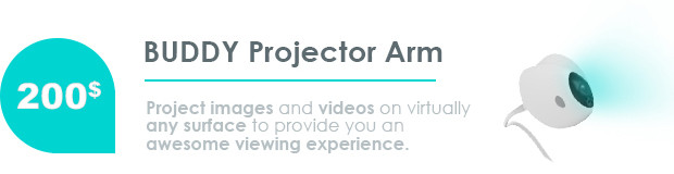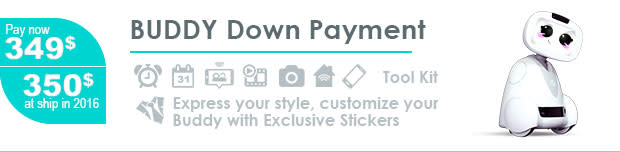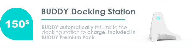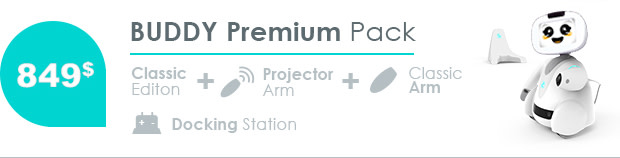 Some accessories for BUDDY are available, such as docking station, arms and pico-projector (Digital Light Processing / WVGA / 16lm /60" maximum display), and will ship in July 2016.