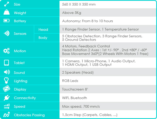BUDDY moves autonomously on his built-wheels at speeds up to 70cm/sec. BUDDY can rotate his head in all directions, enhancing how he interacts with you.