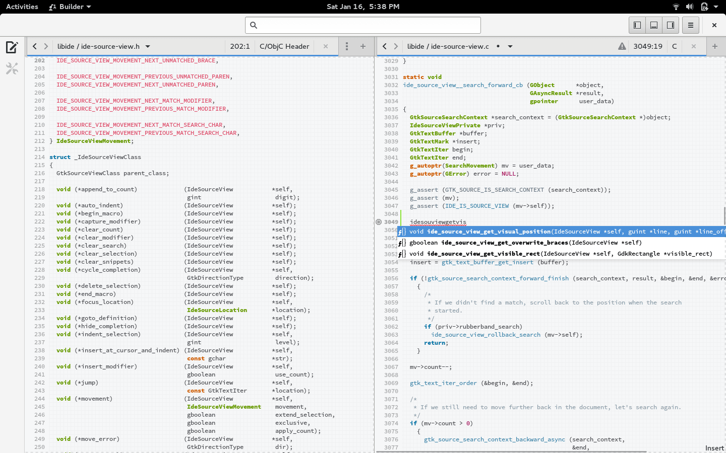 Project ManagementBuilder is designed to manage your autotools based project. We manage the complex bits so you don't have to. Focus time more on writing your application and less time on build system rules. Asset CatalogTo simplify the management of user interface templates, icons, setting schemas, CSS styling, and embedded files, we've included a built in asset manager. Just navigate to your project details to see more. API ExplorationLearning new APIs can be a time consuming process. To save you time we've added support for navigating types from right within the source code editor. You can jump to a type declaration with just a click. Split ViewsWith Builder you can place content where you want it. Multiple editors side by side is no problem. You can even place documentation next to code so you don't have to keep switching contexts. Jump to SymbolNavigating large files can be difficult. So Builder includes everything you need to jump around your source code whether it's within the same file, or somewhere else in your source tree. Global SearchAt the top of Builder is the Global Search bar. You can use this to jump between files, open new files, locate symbols, search documentation and more. Glade Built InBy integrating Glade, Builder simplifies creating new Gtk+ widgets with templates, embedded icon themes, CSS, and more. Jump between the designer and code in an instant. DocumentationBrowse the comprehensive documentation provided with the libraries you use most. If you don't find what you are looking for or don't understand it, you can flag the documentation for improvement by the GNOME developers. Quick HelpWhen auto completion is enabled we'll provide you documentation right at your fingertips as you type. No more jumping between documentation and code to see what that parameter means. Global NavigationTo make it easier to jump back to what you were just doing we've added Global Navigation. It works just like your web browser. We keep track of where you are in the IDE and you can move freely backwards and forwards. IDE Scripting4You can optimize your workflow with the scripting capabilities provided by GObject Introspection and GJS. You'll have access to all the APIs inside of Builder to make it do exactly what you want.