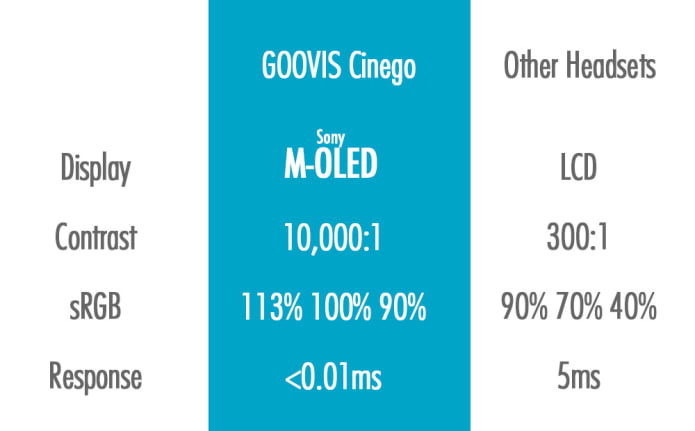Goovis Cinego uses twin M-OLED 1920 x 1080 displays measuring 0.7 inches with a PPI of 3147. This means the Cinego has 7x the pixel density of larger M-OLED devices such as the iPhone X to provide you a clearer, smoother and more detailed picture quality.