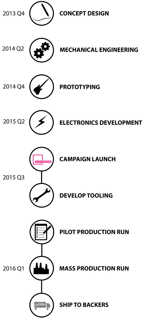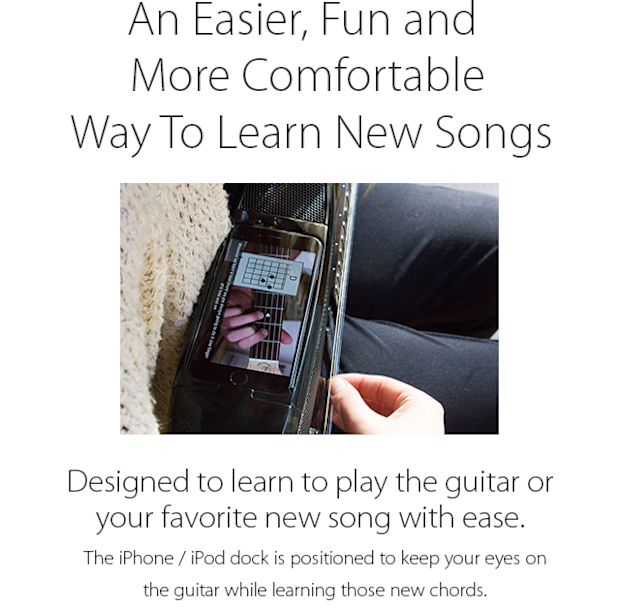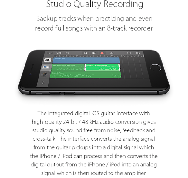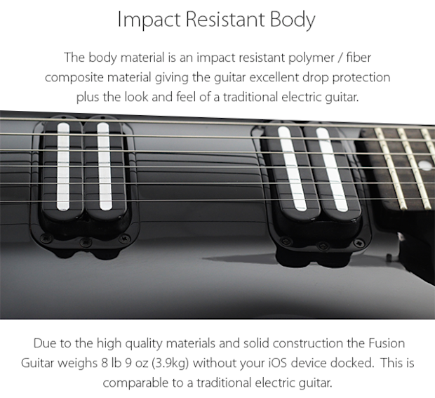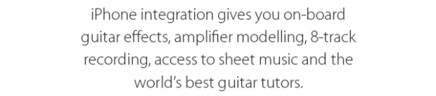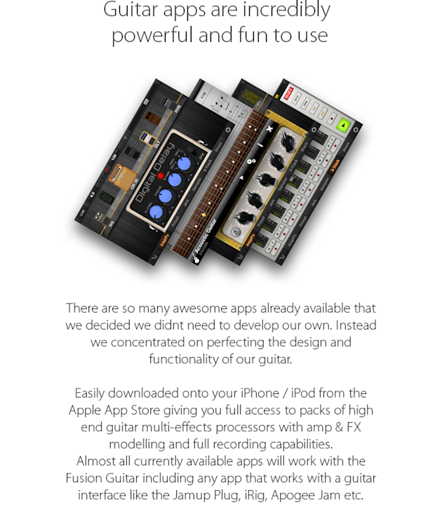 A traditional electric guitar can connect to an iPhone via a guitar interface (a hardware device) with cables. You will also need either headphones or powered speakers again connected with cables. Guitar apps are incredibly powerful and fun to use, but it’s an awkward set up - you have cables everywhere and you have to balance the phone on your knee or a coffee table. The Fusion Guitar allows the whole setup to be portable and without any cables.