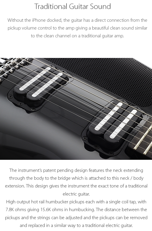 The iPhone is fully functional even when docked in the guitar, this means that phone calls can come in and will ring through the speakers. It’s easy to avoid getting a phone call while performing simply by setting your iPhone to Do No Disturb or Airplane Mode.
