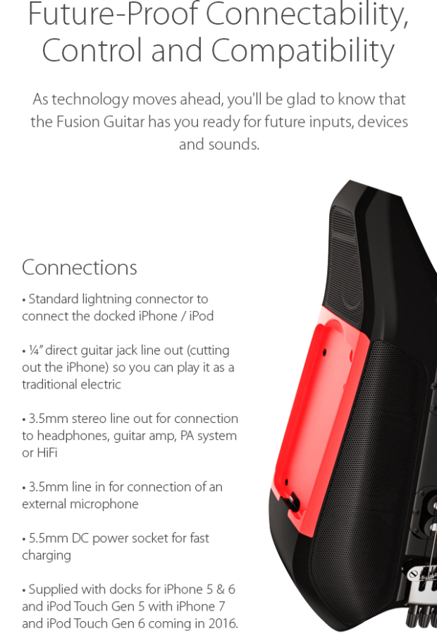 Yes, the Fusion Guitar’s interchangeable docks allows it to be compatible with future iPhone models. We will release new docks to suit iPhone 7 and iPod Touch Gen6, Gen7 etc. shortly after the devices are launched. The iPhone 6S is not anticipated to include external changes to its design, if the 6S has external changes we will incorporate those into the iPhone 6/6S dock which will be delivered with your guitar. The earliest anticipated new dock designs will be available in late 2016/2017 when Apple releases the iPhone 7 and iPod Touch Gen 6. The lightning connector on the guitar can also be easily removed and replaced if the connector becomes damaged or if future iPhones have a different type of connector.