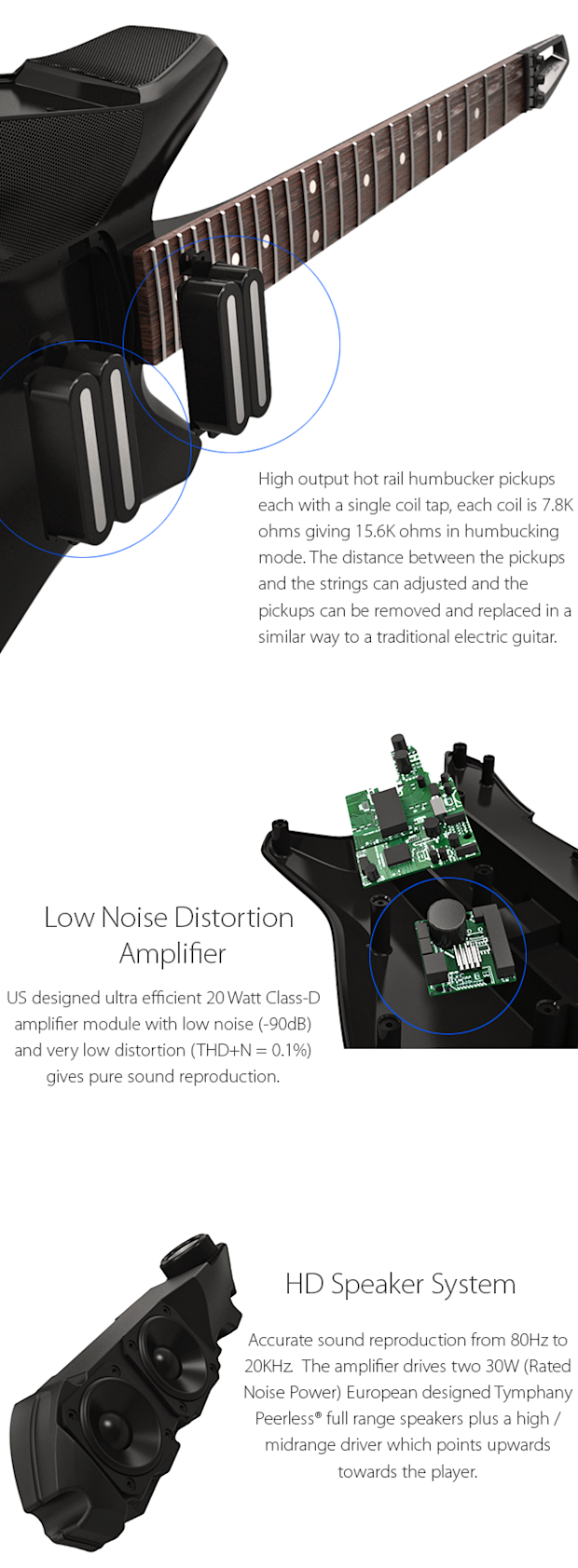 The Fusion Guitar sounds awesome. The maple neck extends through the body and the bridge is attached to this neck/body extension, this give the instrument the exact tone of a traditional electric guitar. This method of construction also give the guitar great sustain, even better than a fixed neck or bolt on neck guitar. Additionally we have not compromised on the pickups, which are responsible for generating a large portion of the guitar’s tone. If you have any doubts about how good the Fusion Guitar sounds check out these sound samples.