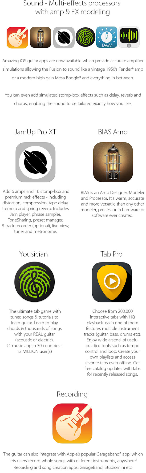 Almost all currently available apps will work with the Fusion Guitar including any app that works with a guitar interface like the Jamup Plug, iRig, Apogee Jam etc.