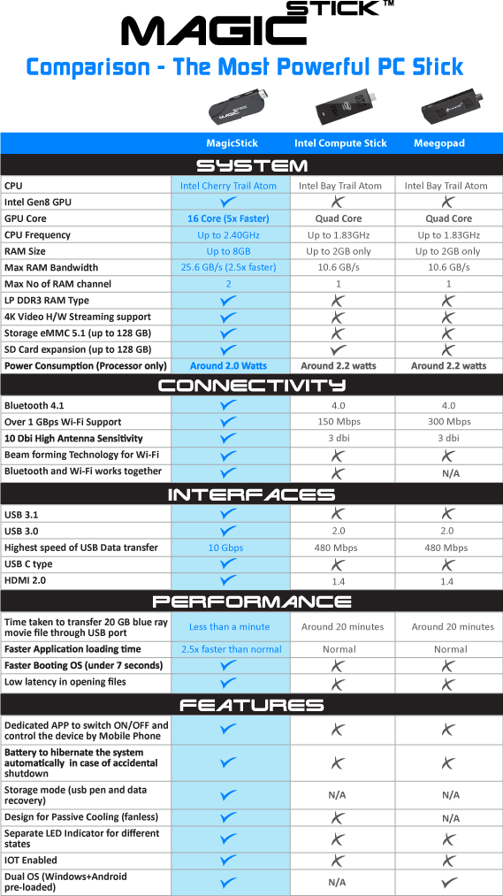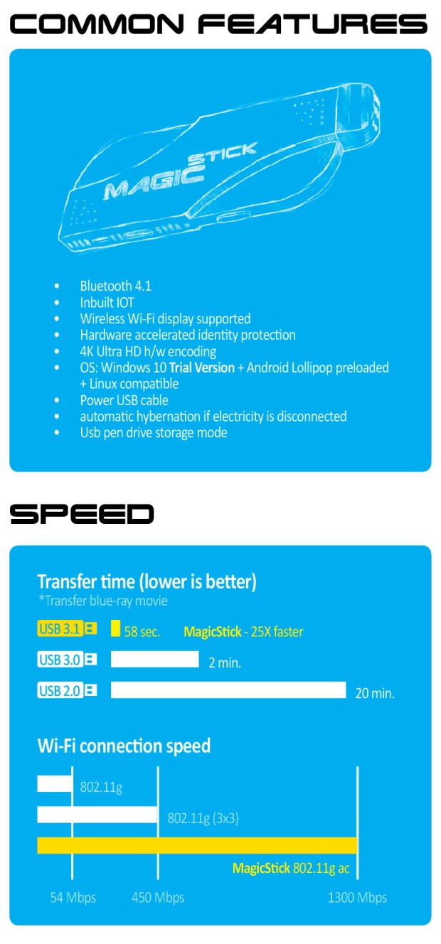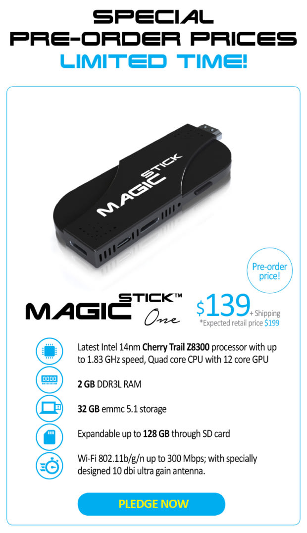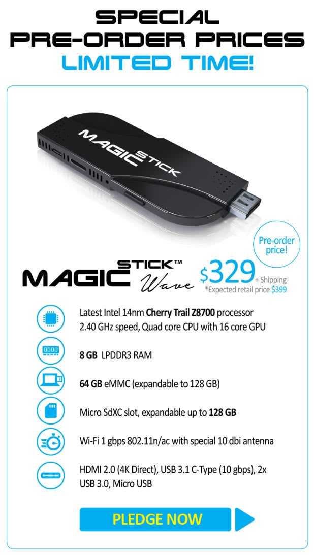 MagicStick is the first PC stick with up to 8GB RAM and Intel’s almighty 14 nm Cherry trail quad core processor with 12/16 core GPU, HDMI 2.0, USB 3.1, 256 GB solid storage.