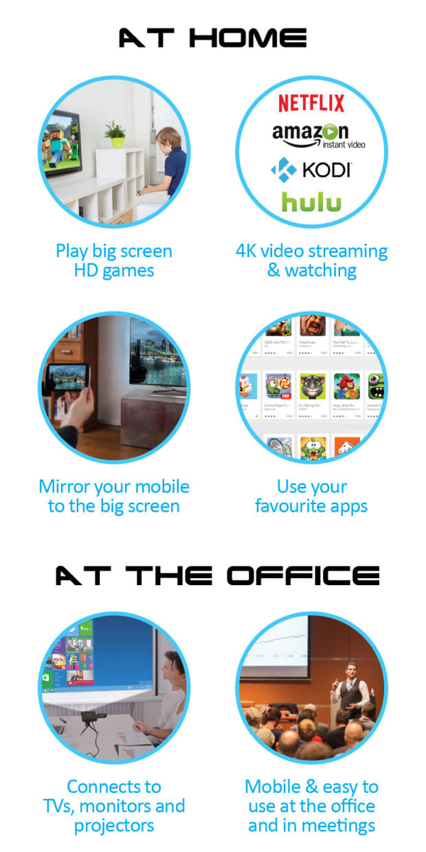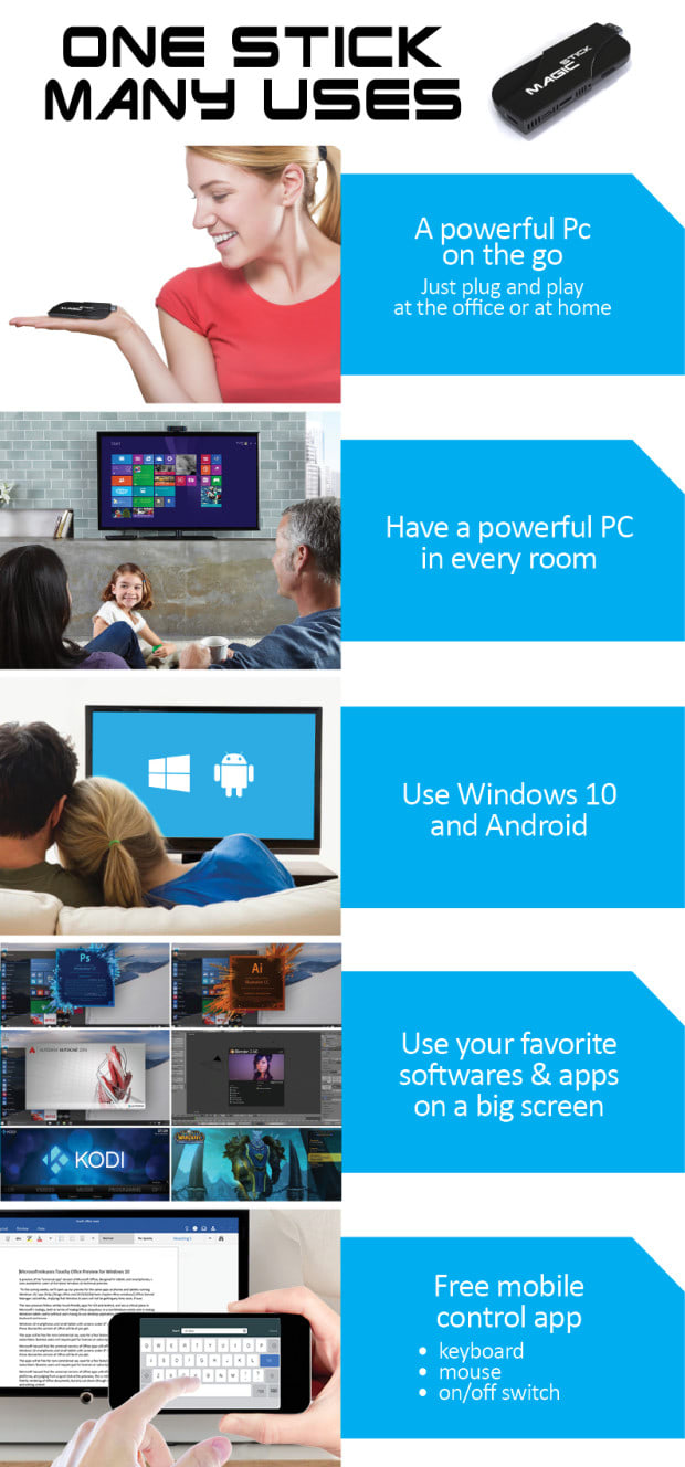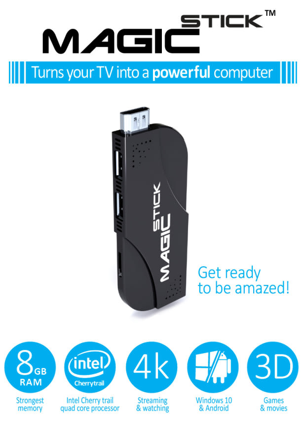 MagicStick is the most powerful PC on a stick that turns your TV into a real computer. Simply plug it to a TV or projector, add a keyboard and mouse or use the free control app for mobile and tablet and you are ready to go!