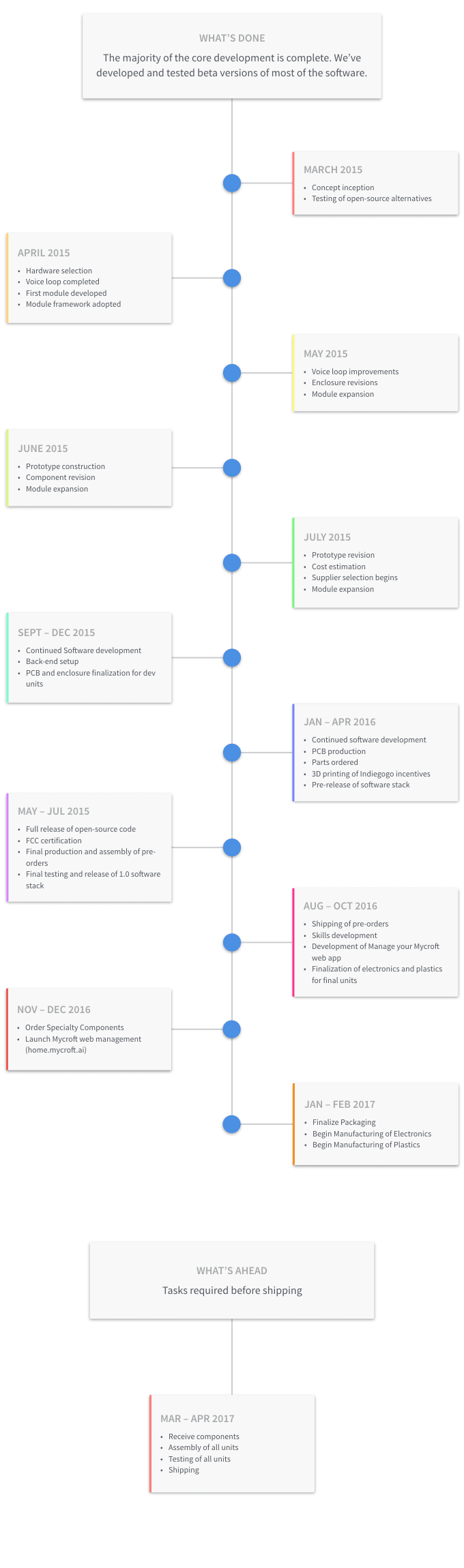 Our team of engineers, designers and developers have already spent months working on Mycroft. We've come a long way from our original voice recognition loop and are getting very accurate results from the cloud. Our AI integration is top notch and 95% of the commands Mycroft is processing are coming back with match probabilities in excess of 90%. We have gone through dozens of software and hardware Revisions and multiple 3D printed enclosures. We’ve done our best to mitigate any risk to putting Mycroft in your hands and are working to deliver exceptional hardware and software.