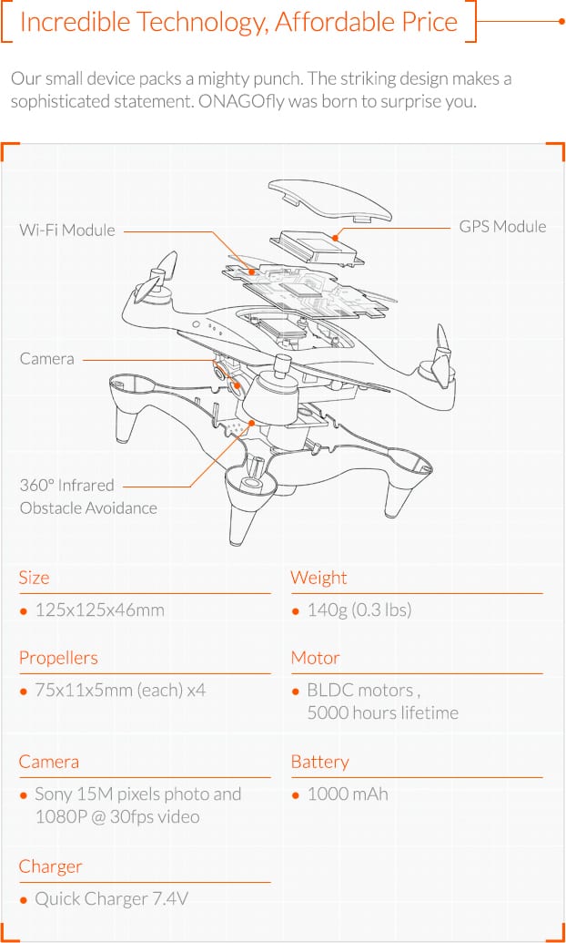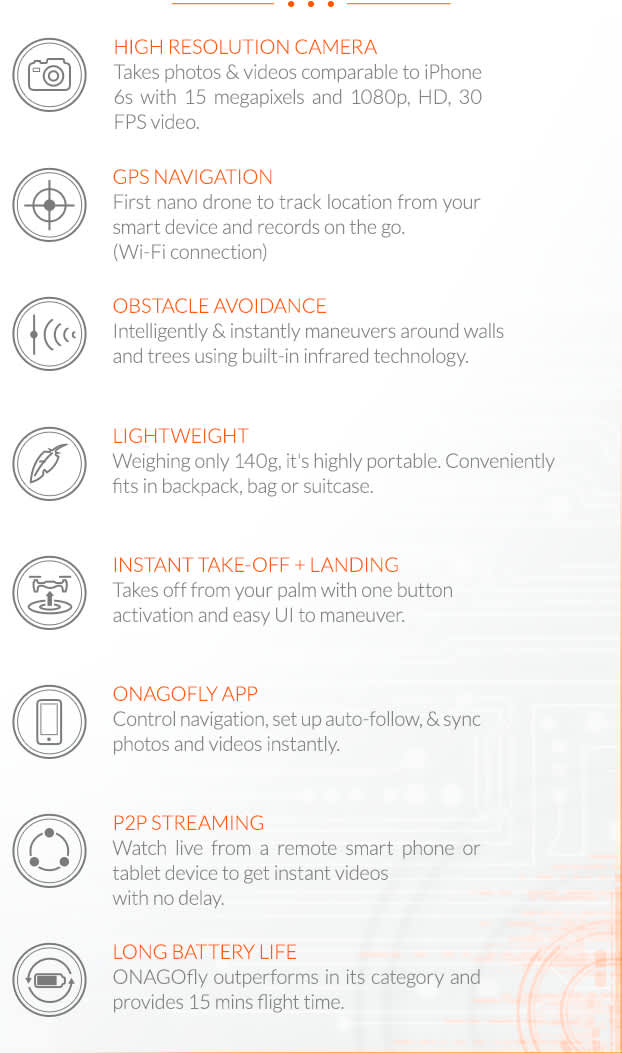 | What is ONAGOfly? | ONAGOfly is the world’s first smart nano drone that has GPS auto follow, high res 15 megapixel and 1080p HD video camera that captures you in all possible angles. Also, you can race and control the drone by using ONAGOfly app to satisfy your drone flying experience |