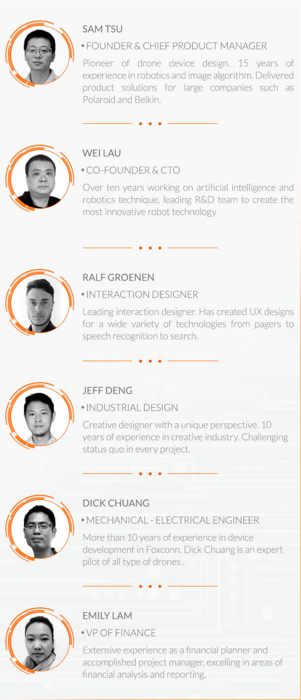 | What's the features of the drone? | 1.Smile face recognition and take a snapshot automatically 2.P2P live stream broadcasting(its the stretch goal) 3.GPS tracking 4.Throw and fly 5.Highly portable 6.Intelligent obstacle avoidance 7.Landing in hands/take off from hands 8.Capture still images when recording |