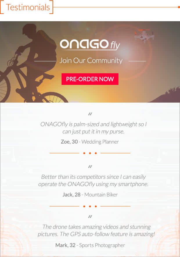 Rather than creating a drone with complicated settings and controls, ONAGOfly believes in simple design coupled with ease of use to maximize the user experience.