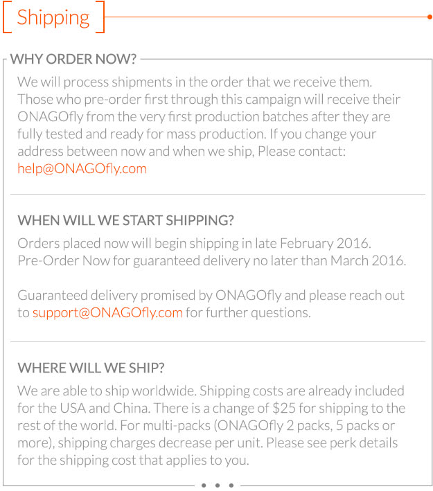 | How much does ONAGOfly cost? | You can pre-order ONAGOfly today for $199 USD. After pre-sales are over, ONAGOfly will be priced at $299 plus applicable taxes and shipping |