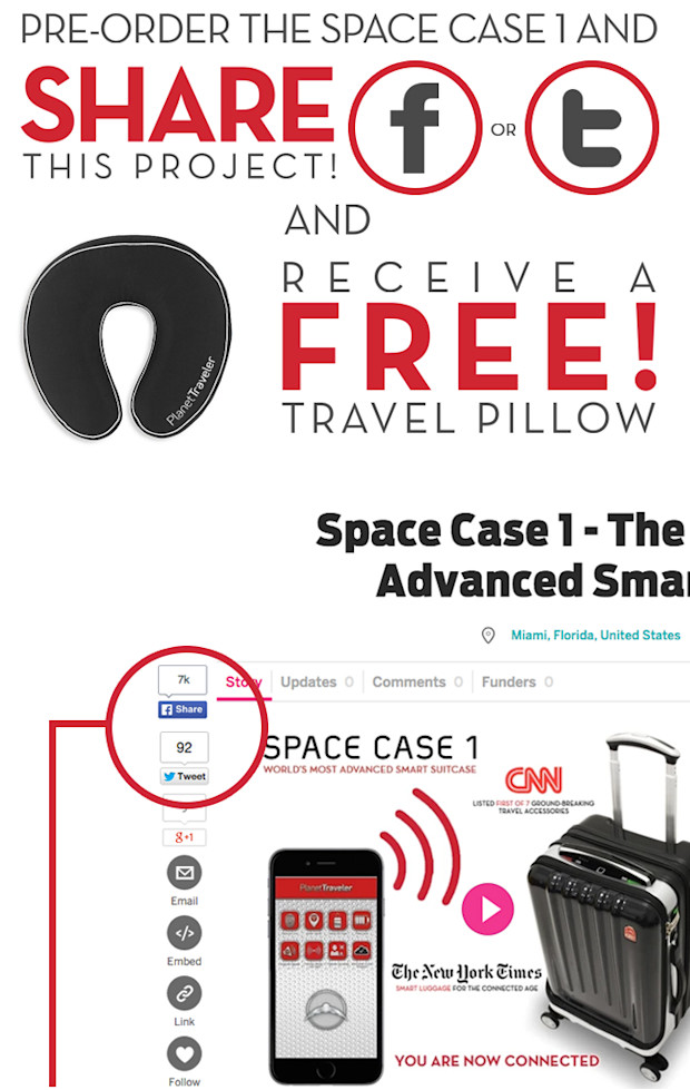 Please help us spread the word via the Facebook and Twitter button circled above and get a Travel Pillow FREE! with your pledge by following steps below: