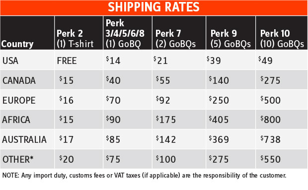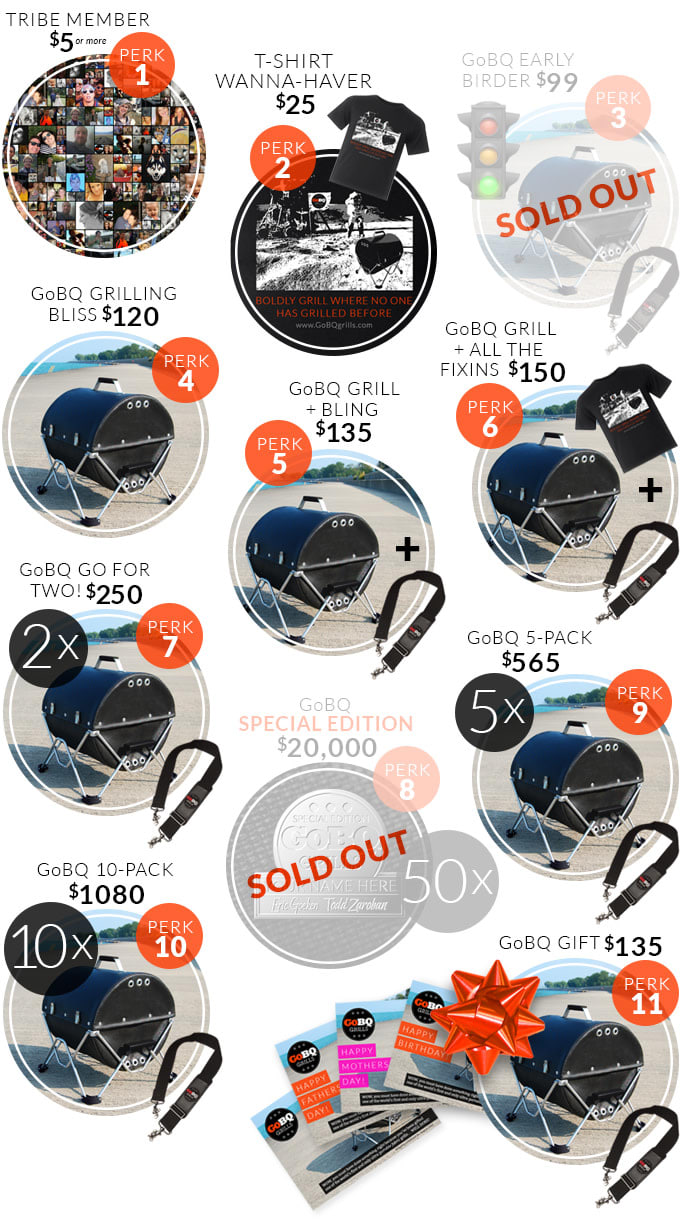 Just want a GoBQ Grill? Click on the right and claim Perk #3 or #4. Want one with a strap? Claim Perk #5! It's as easy as that. But don't forget to add shipping costs to your total contribution or we'll have to come back and nag you for that stuff!