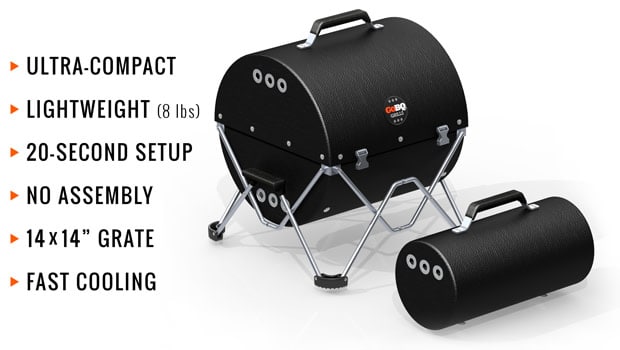 Introducing the world’s first and only ultra-portable packable fabric grill. Made from fireproof fabric, the GoBQ folds up like a camping chair and fits in a backpack, a drawer, or slung over your shoulder. It's lightweight and compact. It’s quick and easy to set up and take down. Oh, and it's pretty dang cool too.