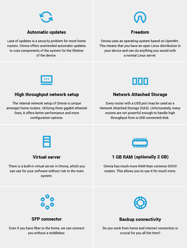 With powerful hardware, Turris Omnia can handle gigabit traffic and still be able to do much more. You can use it as a home server, NAS, printserver and it even has a virtual server built-in.