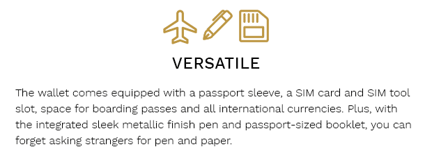 But, Voyager isn't just about Smart Technology it's about clever functional design too. Need a wallet to fit in a Pen, Passport/Passport size booklet, flight boarding pass, cards, all international currencies, sim card & sim tool yet fitting right into your pocket?