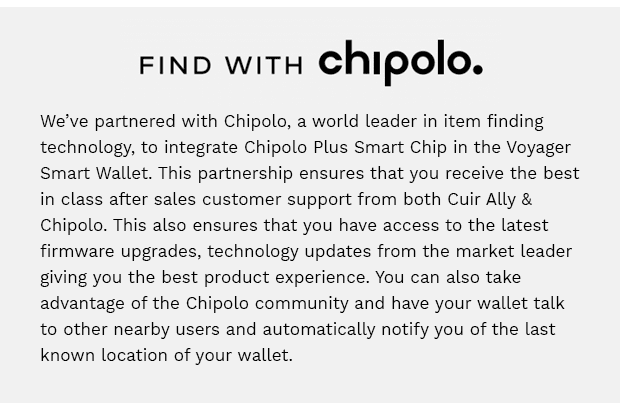 In the 11th month of usage, you will be receiving a notification alerting you to replace the chip. The integrated smart chip is placed within a securely hidden slot in the wallet and is easily replaceable. New replacement smart chips shall be shipped to you, which shall also have a 1 Year Warranty. After one year, users can take advantage of the Chipolo Renewal Program to get a replacement smart chip. Refer https://cuirally.com/faq/faqs/how-long-will-the...