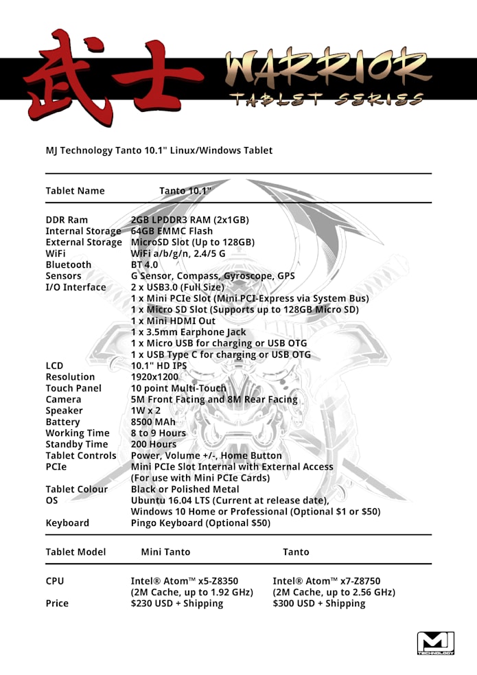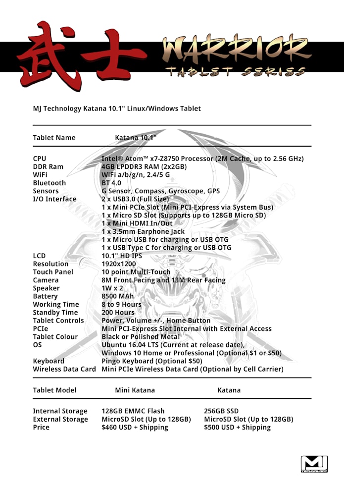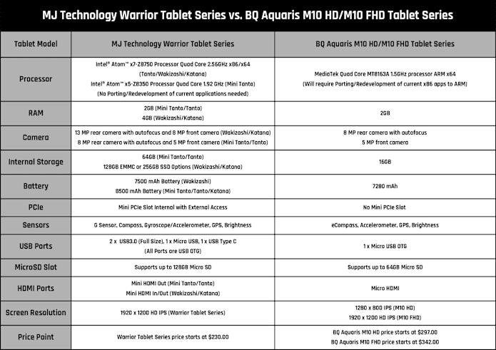 MJ Technology presents our "Warrior" series of Tablets. Pledge for one today here on IndieGoGo and join "The Way of the Enlightened Warrior." Please take a moment to review the specifications below of each model in our Tablet series, and begin your journey on the enlightened path.